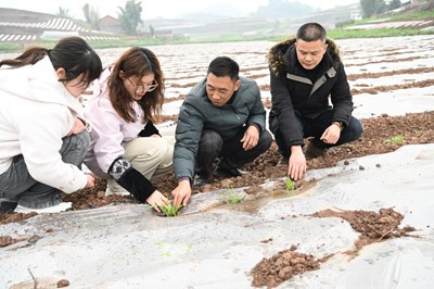 春播现场春意浓。“地膜两边,一定要用泥巴扎牢,免得刮大风把地膜揭开了,影响玉米地保湿保温,也不怕地膜下的草草窜出来‘争风吃醋’。”镜头穿过远处初放的油菜花,扫过田边绽放的紫色胡豆花,聚焦到土埂边的新农人刘忠平,只见他皮鞋裤脚沾满了泥土,嘴里不停地对干活的村民吆喝着,还手舞足蹈。