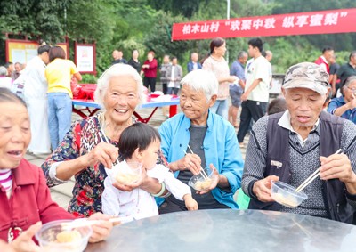 2025年9月27日,四川省华蓥市华龙街道柏木山村的村民汇聚在村头品尝糍粑,在开心中迎接国庆、中秋佳节来临。(邱海鹰/报道)
