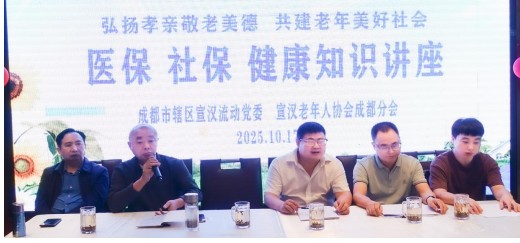 汇聚多方力量,共筑老年福祉。10月17日,在重阳节来临之际,由成都辖区宣汉县流动党委、宣汉县老年人协会成都分会联合主办的“医保、社保、健康知识讲座”在成都市双流区蓉鼎酒楼成功举行。活动特邀宣汉县医疗保障事务中心、宣汉县社保局、成都市安德医院及中国平安四川分公司等相关部门的领导与专家进行授课。宣汉县流动党委、老协成都分会班子成员、各支部及片区负责人、家庭医生代表、各单位驻蓉退休小组负责人等共计50余人参与。流动党委书记、老协成都分会会长何其贵主持讲座。