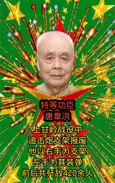 至今健在90岁高龄的抗美援朝神炮手、特等功臣唐章洪就是其中一员。1935年他出生于四川省中江县集凤镇(原石泉乡),是中国人民志愿军老战士、四川省模范退伍军人。为保家卫国1951年2月,不到16岁的他就参军入伍,4月入朝作战,成为中国人民志愿军第十五军第四十五师第一三五团八二迫击炮连战士。在抗美援朝战争中,唐章洪先后参战一百多次,荣立特等功一次、一等功两次、二等功一次、三等功三次,共歼敌620多人。