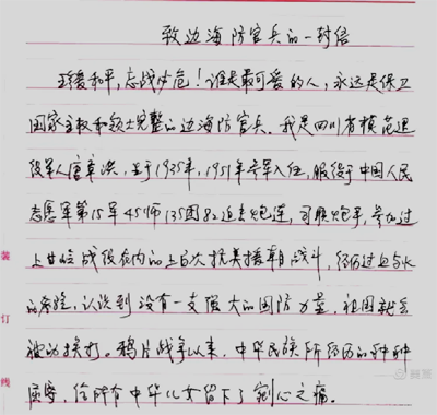 他十分关心边海防建设,给官兵致信: 勉励他们“珍爱和平,忘战必危!谁是最可爱的人,永远是保卫国家主权和领土完整的边海防官兵!”