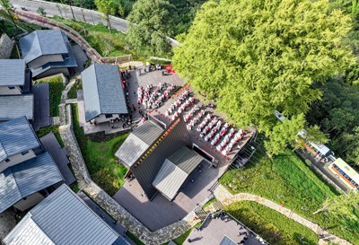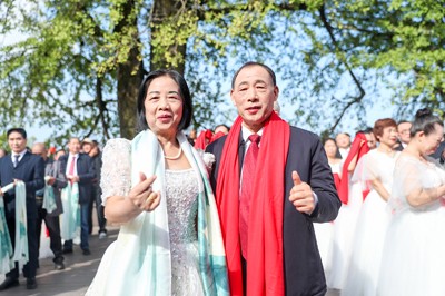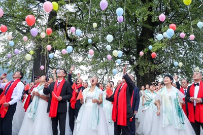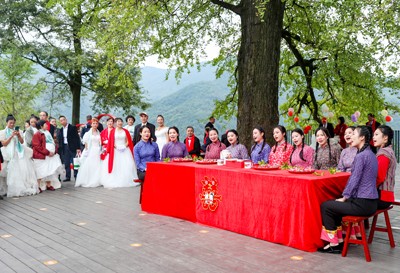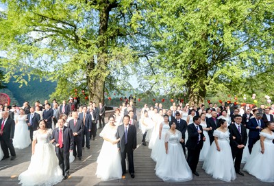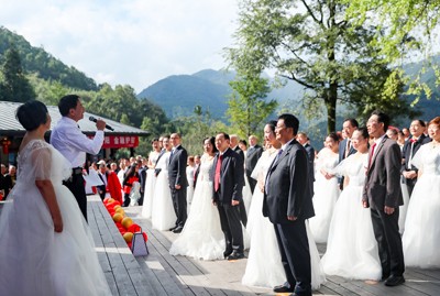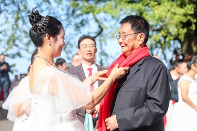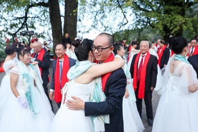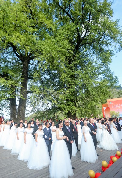 2025年10月28日,四川省华蓥市100对身穿婚礼服装的老年夫妻,来到华蓥山山居民宿“十里芳菲?红岩美村”前的千年“夫妻银杏”树下,在市民的祝福中参加重阳节金婚银婚纪念活动,他们携手走过“时光隧道”,通过参加悬挂“同心锁”,分享“幸福秘诀”,集体爱情宣言,放飞心愿气球,合唱“歌唱祖国”等红歌,观看非遗“坐歌堂”等文艺节目,为爱加冕,喜迎重阳佳节。