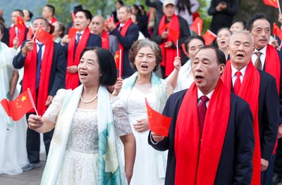 2025年10月28日,四川省华蓥市参加重阳节金婚银婚纪念活动的老年夫妻,在华蓥山千年“夫妻银杏”树下合唱红歌“歌唱祖国”。