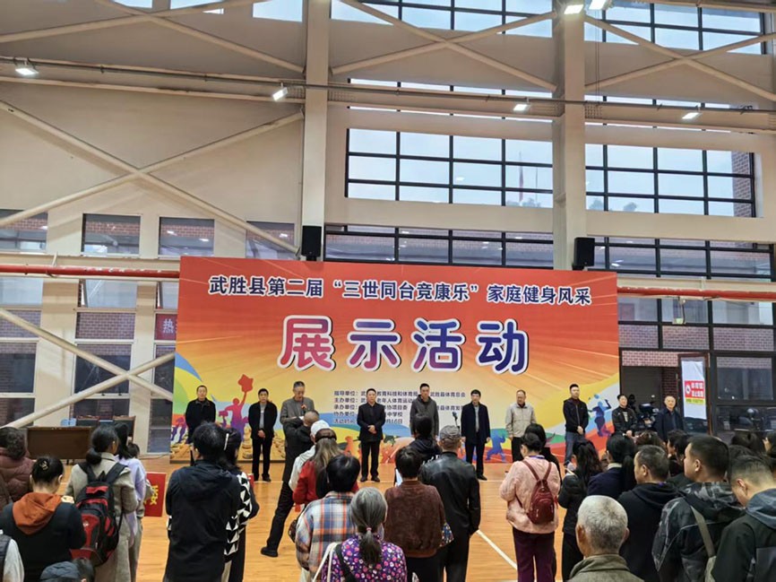 2025 年 11 月 16 日,武胜县第二届 “三世同台竞康乐” 家庭健身风采展示活动在县全民健身中心热闹启幕,来自全县各乡镇及社会团体的59个家庭代表队的 260 余名运动员、工作人员与裁判员齐聚一堂,以家庭为单位同台竞技,点燃全民健身热潮。