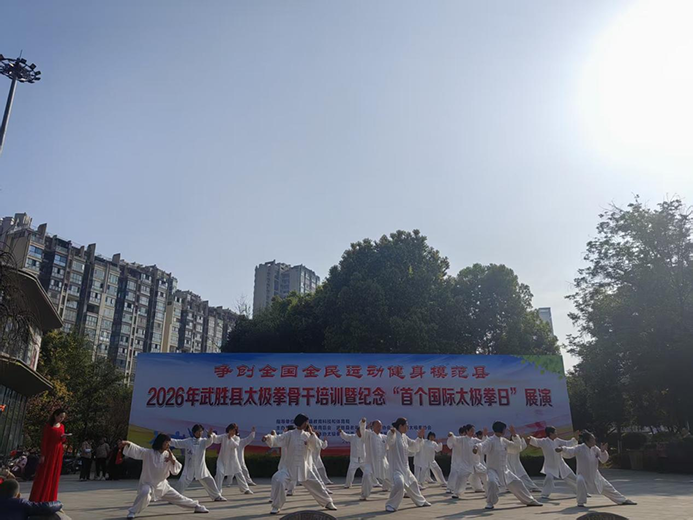 3 月 21 日,世界首个国际太极拳日当天,武胜县人民广场太极神韵飞扬、场面热烈隆重,纪念世界首个太极日展演活动成功举办。