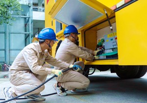 2023年7月16日,由四川广安市特派的电力保供人员,在成都市高校篮球比赛项目训练场馆外,连接应急发电车电缆线路。