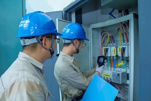 2023年7月16日,由四川广安市特派的电力保供人员,在成都市高校篮球比赛项目训练场馆对空调用电配电箱进行检查。