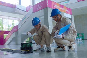2023年7月16日,由四川广安市特派的电力保供人员,在成都市高校篮球比赛项目训练场馆内,对运动员临时休息区用电插座进行安全检查并进行维护。