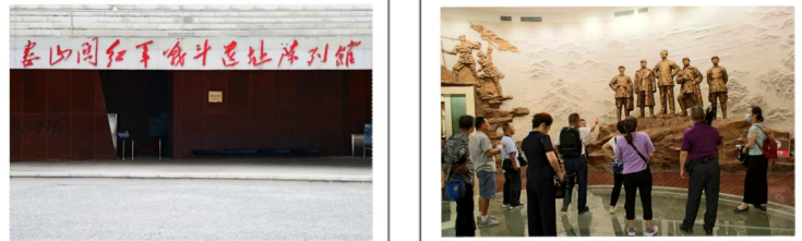 图(1)娄山关红军战斗遗址陈列馆大门前的场面,中间就是粹石,没有其他装饰,没有停车的场地,简单、扑素、大方实为少见;图(2)娄山关红军战斗遗址陈列馆标志。