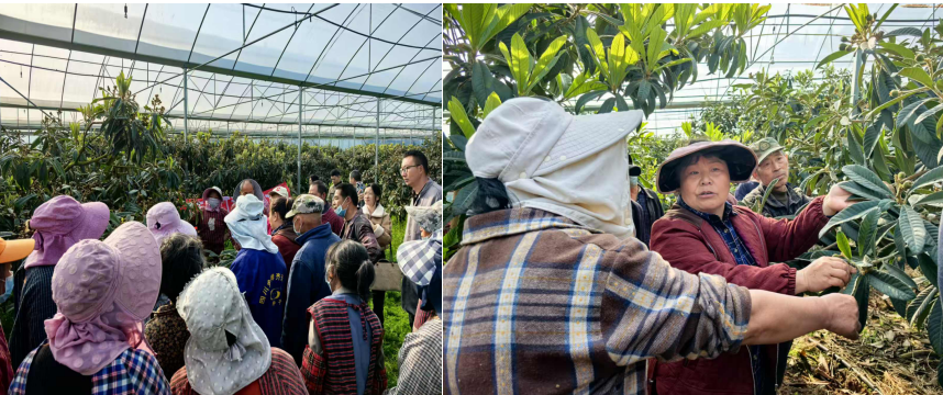 周文英专家发放枇杷春管行事历,着重引导果农开展大棚枇杷“温湿管理、施肥保果、疏果套袋、抹除副梢”。