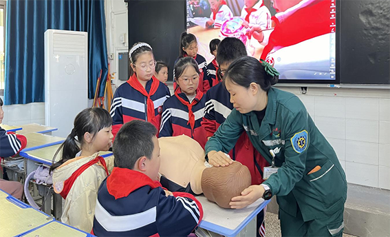 最受孩子们欢迎的环节当属心肺复苏互动演练。在渠县人民医院急诊科护士长罗媛的带领下,医护人员将模拟人带入操场,手把手指导学生们进行胸外按压、人工呼吸等实操训练。“手臂要伸直,按压位置在这里,对,就是这样!”孩子们在医护人员耐心指导下认真模仿、反复练习,在沉浸式体验中掌握了基本急救技能,现场气氛热烈而有序。