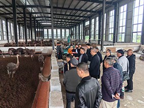 “单一产业抗风险能力弱,只有走多元化发展之路,才能让乡村产业走得更稳、更远。”秉持着这样的发展理念,赵从虎不断拓宽产业布局,先后建成年出栏2000头商品猪的规模化养猪场,两年前又紧跟市场需求,打造鸵鸟养殖基地,成为合江县规模鸵鸟养殖第一人。目前,农场已建成3000平米标准化养殖厂房,养殖鸵鸟600只,配套种植牧草200亩,形成了种养结合、多元发展的产业格局。面对会员们的好奇与提问,赵从虎耐心细致地讲解鸵鸟养殖技术、生长习性,以及鸵鸟蛋、肉、毛的高营养价值与可观经济价值,分享自己接轨市场、因地制宜发展特色产业的经验心得,让在场会员深受触动。