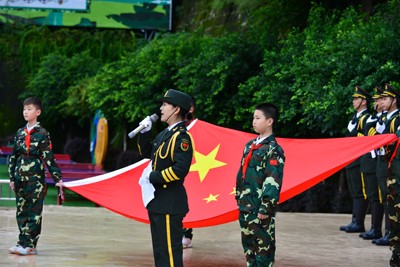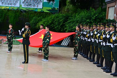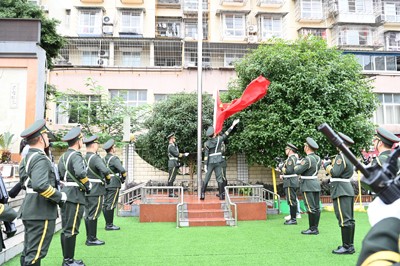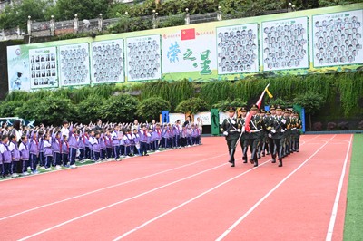 国旗飘扬,军魂铸就。清晨,校园内全体师生整齐列队。由荣县退役军人志愿服务队组成的国旗护卫队身着戎装,步伐铿锵,护送五星红旗走向升旗台。“向国旗敬礼”!伴随礼兵洪亮的口令声和伴随着雄壮的《义勇军进行曲》,升旗手振臂扬旗,鲜艳的国旗冉冉升起。全体师生肃立行注目礼,少先队员行队礼,爱国情怀在每个人心中激荡。