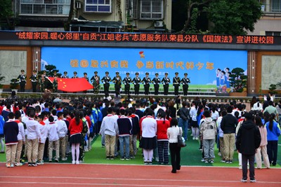 10月13日,自贡“江姐老兵”志愿服务队荣县分队国旗护卫队走进荣县荣新小学校校园,开展庄严的升国旗仪式和宣讲《中华人民共和国国旗法》“戎耀家园·暖心邻里”红色主题活动,以庄严的仪式和主题宣讲,为师生们上了一堂深刻生动的爱国主义教育课。这是自贡“江姐老兵”志愿服务队荣县分队国旗护卫队一个月前成立后,首次进入校园开展升旗仪式和开展《中华人民共和国国旗法》主题宣讲。